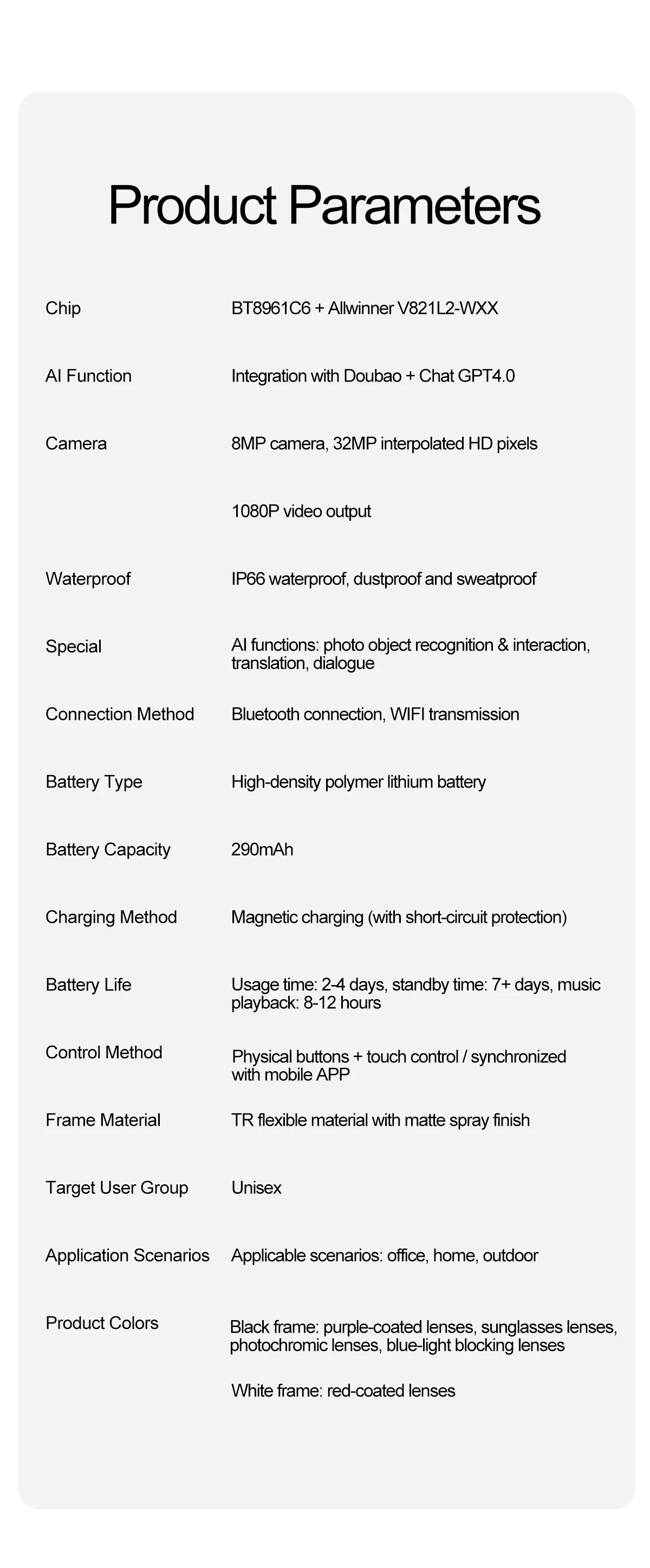 Function: Music,Camera,VIDEO,Voice Assistant,calling,Sun protection,Anti-blue light,AI translator,Chat gpt,Ai